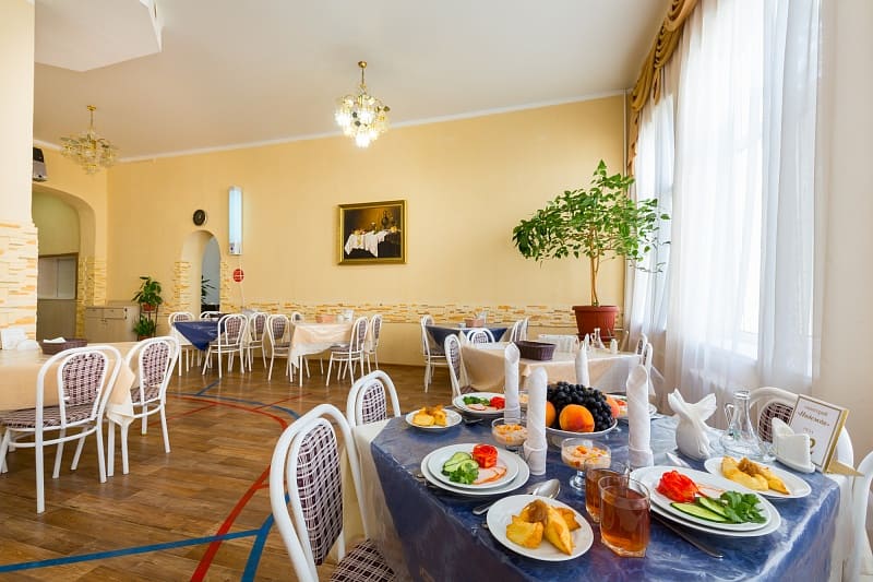 В санатории организовано трехразовое питание по системе «меню-заказ»: разнообразие меню, диетические блюда из 15 диет.