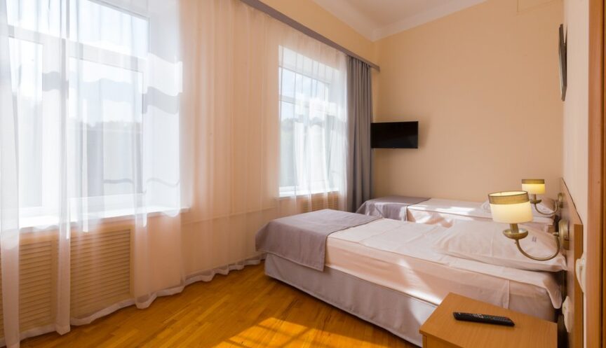 Улучшенный однокомнатный номер площадью 14 кв. м. В номере есть две односпальные кровати или одна двуспальная кровать, прикроватные тумбочки, стол, стулья и шкаф. Также в номере установлены телевизор, холодильник и электрочайник. Санузел с душем, предоставляются туалетные принадлежности и фен. Дополнительное место можно обустроить с помощью еврораскладушки.